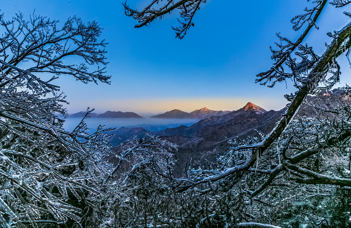 海拔1700米的天堂寨,冬天是冰雪的世界,树枝挂满冰凌,晶莹剔透。清晨,暖色的阳光照射在山尖,形成了大别山特有的日照金山景观。