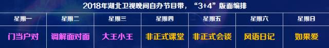 2018年,湖北卫视在节目编排布局坚持创新,用精益求精的专业品质打造出更多兼具创新性、艺术性、可看性、公益性于一体,深受广大受众喜爱的作品!频道将采用“3+4”的节目版面编排,周一到周三情感节目带,包括《大王小王》、《门当户对》、《调解面对面》等收视稳定的周间节目。周四到周日缤纷节目带,《非正式课堂》、《非正式会谈》、《风语日记》、《如果爱》等,“综N代”与“综新人”联袂交错!