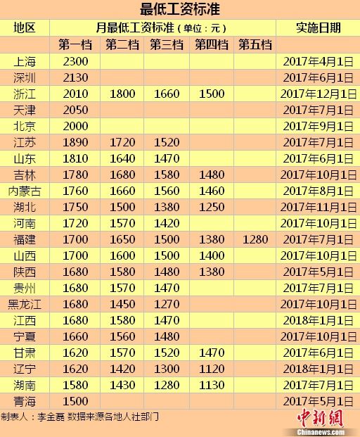 进入12月,浙江省最低月工资标准自12月1日起调整为2010元、1800元、1660元、1500元四档。辽宁省近日也宣布自2018年1月1日起上调最低工资标准。