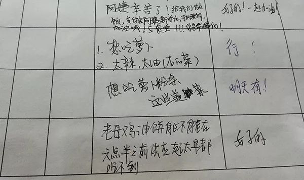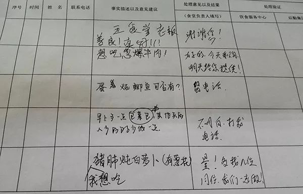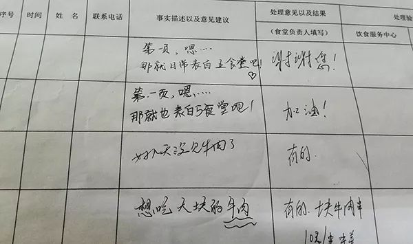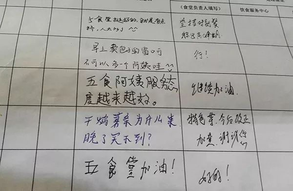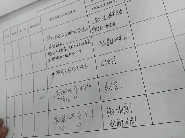 意见簿功能上的转变就能窥见一二。“之前我们的意见簿上,学生基本是是提问题的,比如口味不够好、卫生有待提高等方面,但现在这些内容基本被各种表扬和心愿给填满了。”