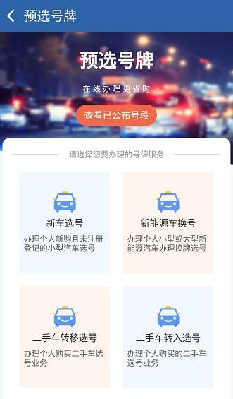 个人登录手机“交管12123”→选择机动车业务,点击预选机动车号牌,进入预选号流程,开始选号→1、阅读须知→2、输入车架号、获取并输入手机验证码,输入个人信息,个人详细地址必录,→3、选号方式选择:选择自主选号还是随机选号→4、获取验证码,手机输入验证码确认号牌→5、收到选号成功确认短信