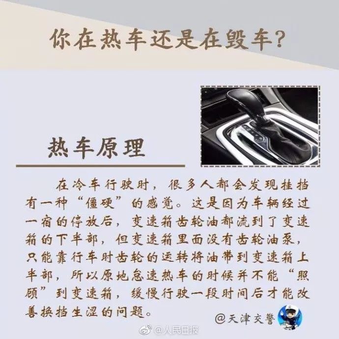 1.出门前一定热车。在发动后30秒至一分钟后上路,但切记勿以高转速行驶,应保持在低车速,发动机转速以不超过3000~3500转为限,一般保持2000转,否则发动机及变速箱所受到的激烈磨损可是无法复原的。待发动机温度上升至正常工作温度后(大概需要3到5分钟时间),再恢复正常驾驶即可。
