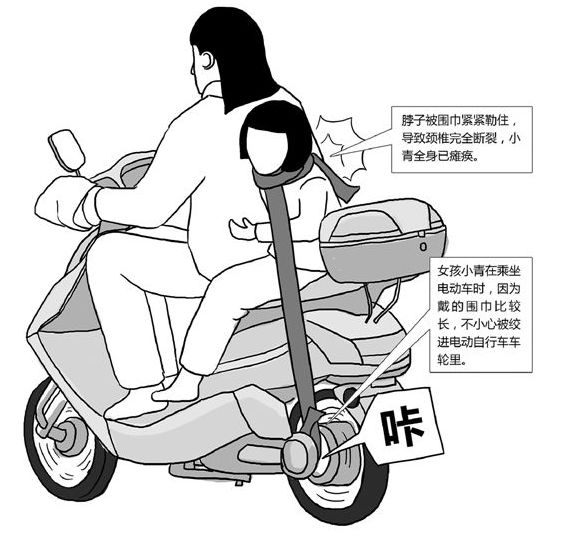 2.千万不要让围巾飘起来,这样围巾很有可能被旁边的东西勾住。另外,坐在电瓶车车后座的人,发生危险系数更高,要尤其留心。