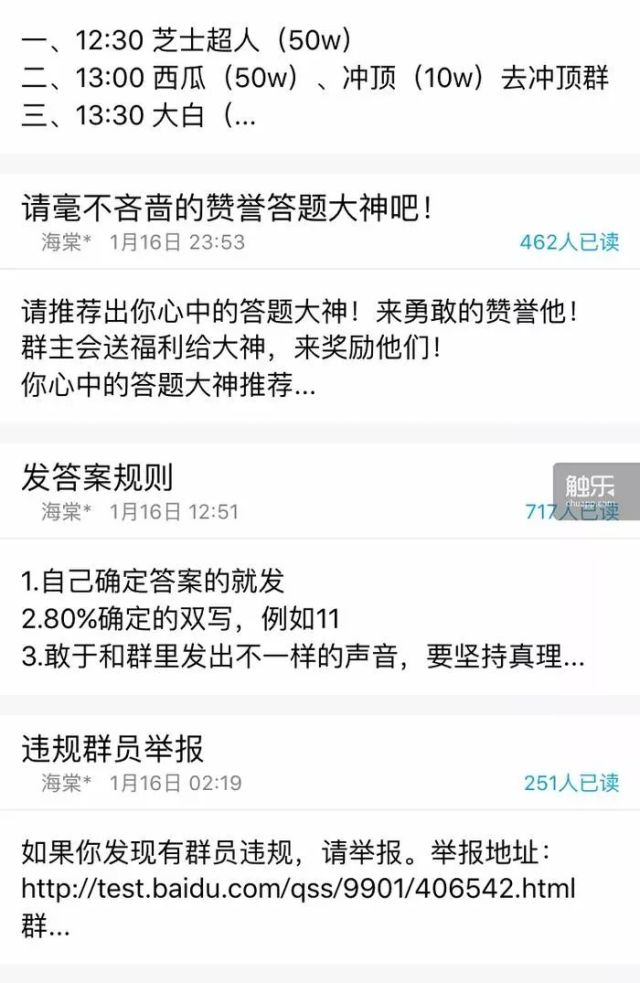 群内网友无不体现着对答题活动的狂热,甚至还有一套“专业化”的管理方式:无论是上网找作弊方法还是正常靠智商答题,一旦某场次开始,大家都会心照不宣地遵守群主定下的各种规矩,比如禁闲聊,用1、2、3代替每题的答案;违规者会被踢出。