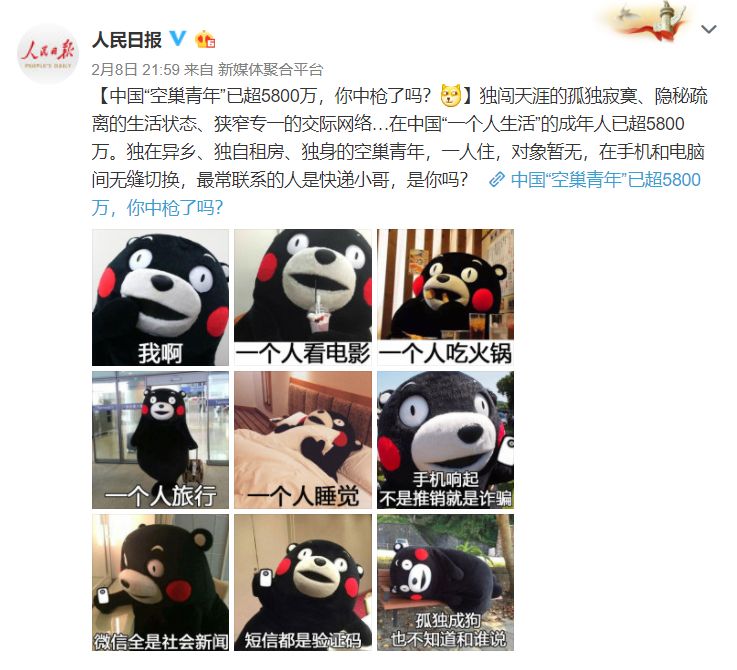 文中称,“空巢老人”“留守儿童”是真正的弱势群体,他们的存在反映出农村、边远地区家庭结构出现了各种问题。而作为青年,在这片土地上就业、生活,有梦想绽放光芒的时刻,也有人生不如意的时刻,正常到不能再正常,实在不需要类似“空巢青年”这种悲情的伪概念渲染。