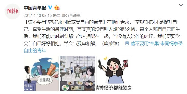 中国青年报曾刊登文章《请不要用“空巢”来同情享受自由的青年》。