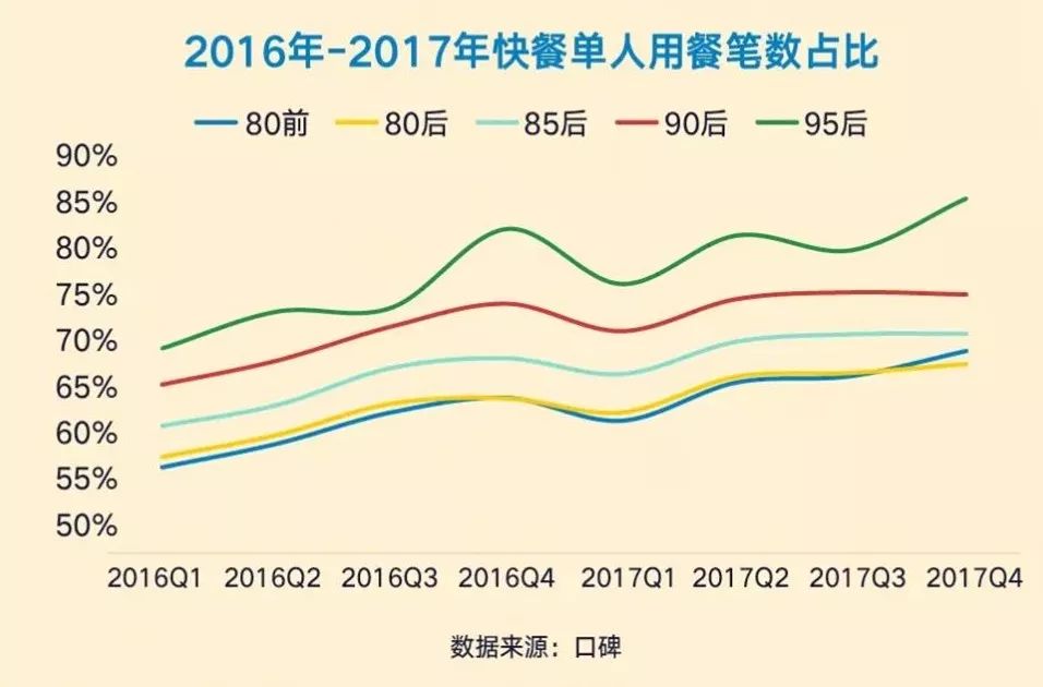 基于口碑数据,各年龄段单人用餐的消费笔数占比均呈现上升趋势,95后更为明显。