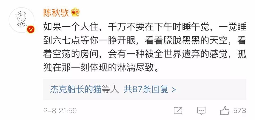文中称,一个内心丰富的人在独处时只会感觉到自己丰富的思想和生活的乐趣。所以,“空巢青年”不过是外界或者真正的孤独者的顾影自怜,而真正勇于选择独居、保持单身的人,其实并不在乎这一称号,因为在他们看来,“空巢”时期才是提升自己、享受生活的最佳时期,尤其是90后的“空巢青年”,其实真的没有别人想象的那么惨。每个人都有自己的生活,我们不能时时刻刻都与他人捆绑在一起,当没有人陪伴的时候,我们更要学会与自己好好相处,学会与孤单和解。