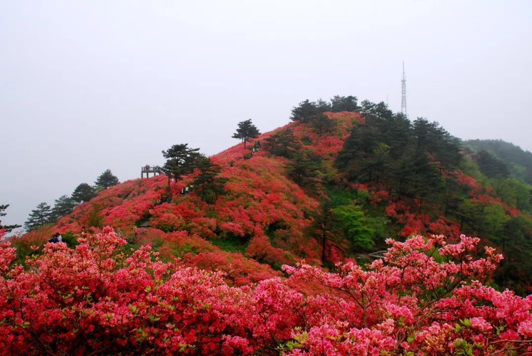 麻城位于湖北东北部、大别山中段南麓,全市共有100万亩杜鹃林。其中,龟峰山有连片的10万亩古杜鹃群落,花开的时候,漫山遍野的杜鹃花色似锦,花如红霞,如火焰,美得令人震撼。