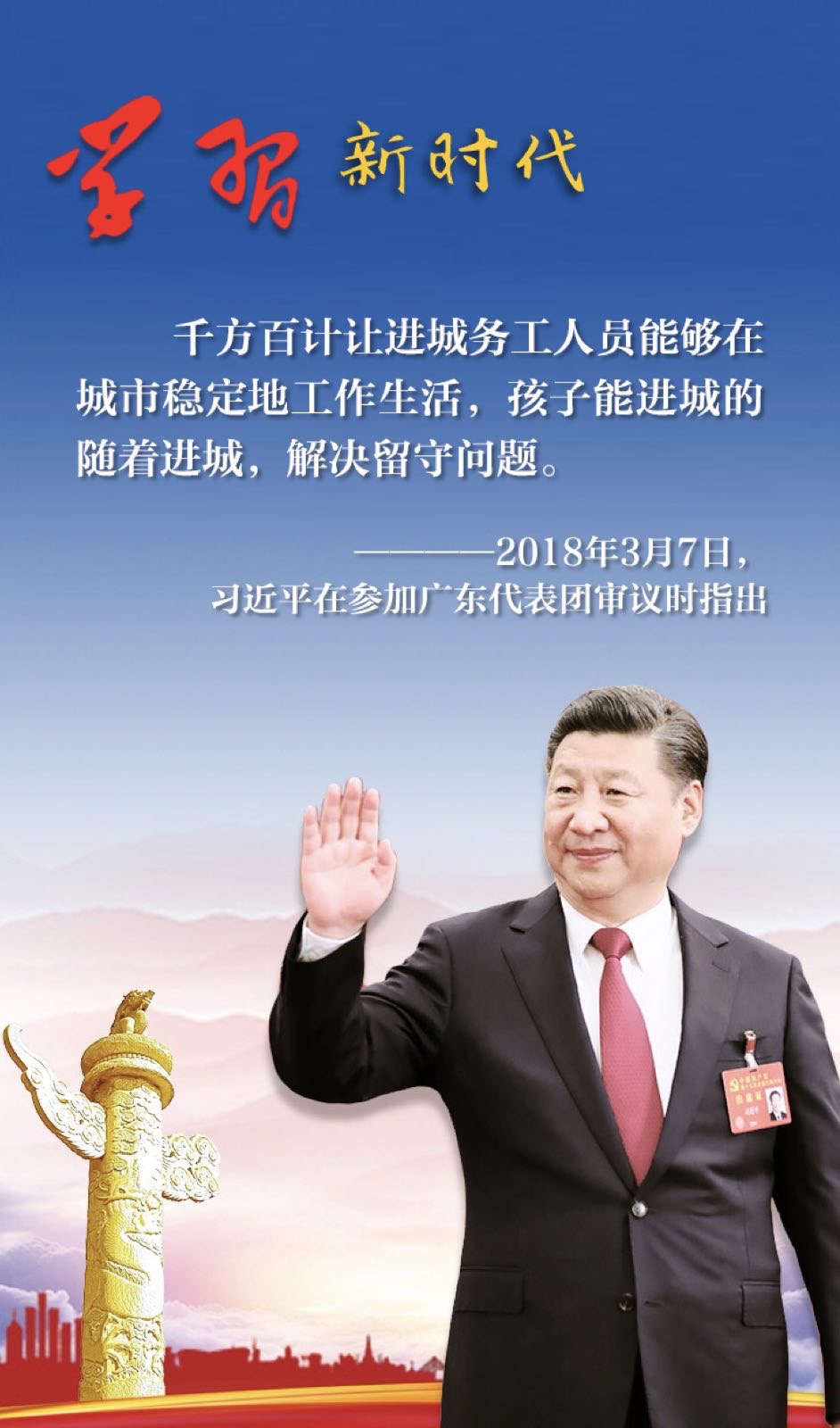 他还认为,米雪梅发言中讲到的外来工子女教育问题带有普遍性,应“千方百计让进城务工人员能够在城市稳定地工作生活,孩子能进城的随着进城,解决留守问题”。说到这里,他对党员干部提出要求:“人民群众什么方面感觉不幸福、不快乐、不满意,我们就在哪方面下功夫,千方百计为群众排忧解难。”