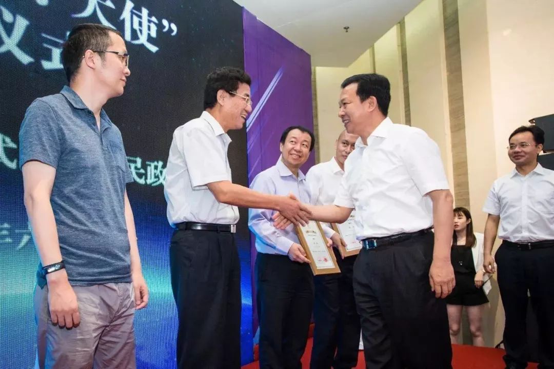 2017年6月,“珞珈创谷”揭牌仪式上,杨汉军(右一)为招才大使颁发聘书 资料图片
