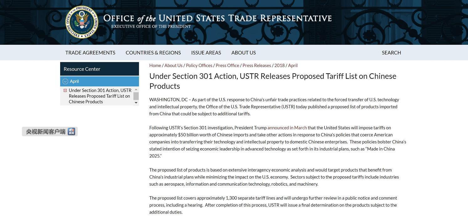 美国当地时间4月3日下午,美国贸易代表办公室在其网站上发布了根据所谓301调查,建议加征关税的自中国进口产品清单,该清单包含大约1300个独立关税项目,价值约500亿美元,涉及航空航天、信息和通信技术、机器人和机械等行业。美国贸易代表办公室建议对清单上中国产品征收额外25%的关税。此建议清单公布后,将有60天的公示磋商期,到期将公布对华301调查最终制裁清单。