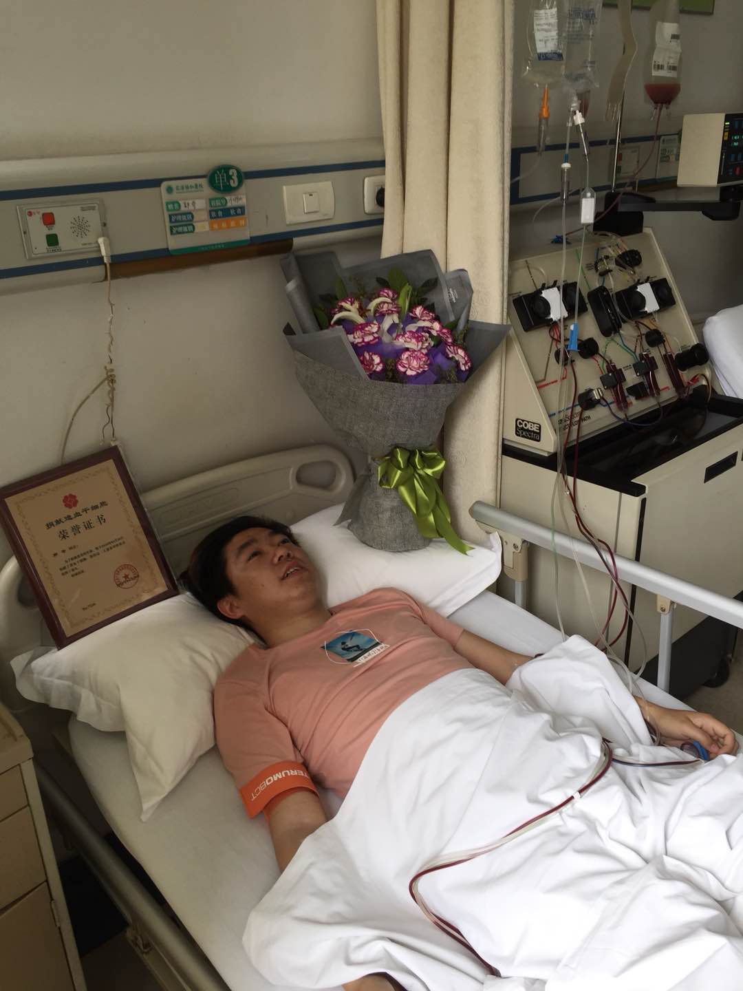 4月20号上午9点半,在武汉协和医院血液科,大学生郭奇躺在病床上,开始进行造血干细胞第一次采集,插在他的左右臂上的长长的管子连着血液分离机,鲜红的血液,连着两个素不相识但性命相关的人。
