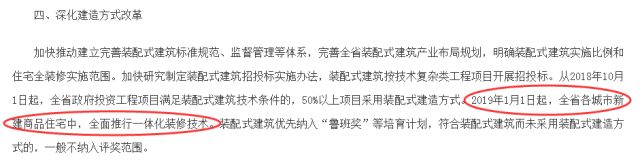 引发刷屏和网友热议的关键,在于省政府近日出台的一个文件——《关于促进全省建筑业改革发展二十条意见》。《意见》中提到,“2019年1月1日起,全省各城市新建商品住宅中,全面推行一体化装修技术。”
