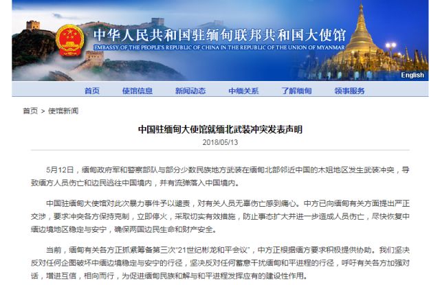 5月12日,缅甸政府军和警察部队与部分少数民族地方武装在缅甸北部邻近中国的木姐地区发生武装冲突,导致缅方人员伤亡和边民逃往中国境内,并有流弹落入中国境内。
