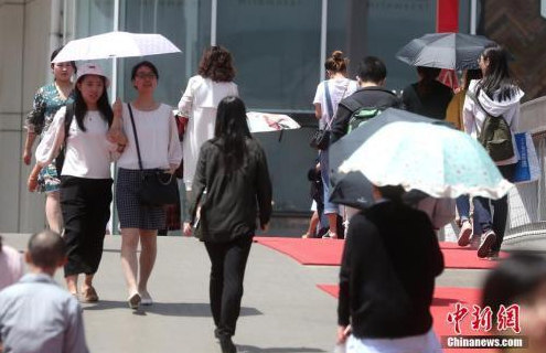 5月23日,北京西单街头,出行的民众撑伞防晒。 中新社记者 张宇 摄
