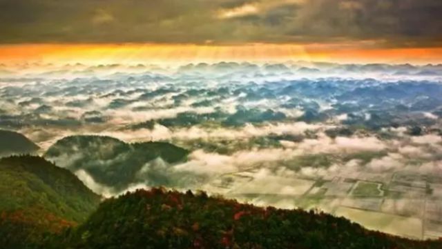 香淹坝,这个很多摄影爱好者慕名而来的地方,从齐岳山遥望,炊烟袅袅,零零散散的民居点缀在稻田间,好似一幅田园油彩画!