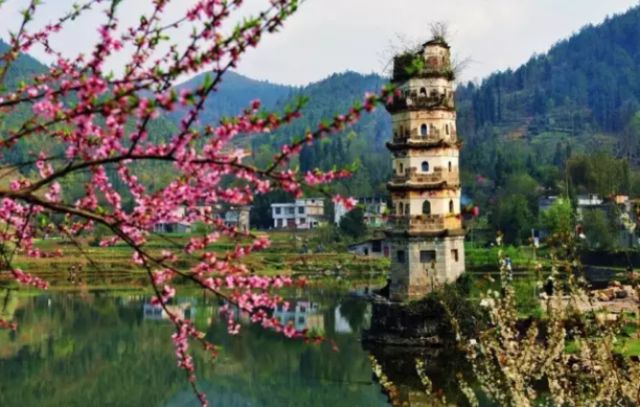 宜影塔修建于清咸丰年间,历经百年沧桑,现被列为湖北省二级保护文物。塔高九米共七层,为典型的六面七角翘檐式砖石结构。轮廓分明,布局合理。塔门两边高大的条石上镌刻着一副对联:“一色长天高捧日,五更沧海倒凌霄”,横批为“宜影塔”。