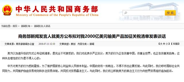 在7月11日外交部例行记者会上,外交部发言人华春莹再次强调,美方行为是典型的贸易霸凌主义。中方将作出必要反制,坚决维护自身正当合法权益。这是一场单边主义与多边主义,保护主义与自由贸易,强权与规则之战。中方将和国际社会一道,站在历史正确一边,共同维护多边贸易体制和规则。