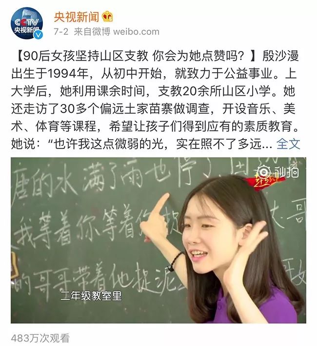 每次支教后殷沙漫喜欢用文字记录点滴这是她在其中一篇散文中写下的:“走你走过的路,吃你吃过的野菜,住你住过的木屋,经历你经历的贫困。原谅我的肩膀不够宽,但想给你无尽的温暖;我的背梁不够挺,但想给你撑起一抹蔚蓝;我的声音不够亮,但我想给你唱起小小的梦想。”