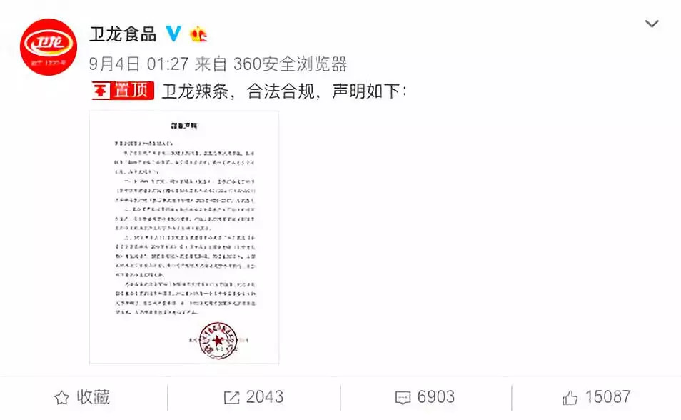 9月4日凌晨,卫龙食品官方发布声明称,卫龙产品完全合法合规。产生分歧的原因是其一直执行现行有效的地方标准,而相关国家标准尚在征求意见阶段。