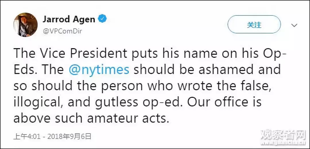 据《华盛顿邮报》消息,6日,彭斯的发言人率先表示:“副总统(要写专栏的话)会署名。《纽约时报》应该感到羞耻,写了那个错误、不合逻辑、胆小的专栏的人也应该感到羞耻。我们办公室不会做这种业余行为。”