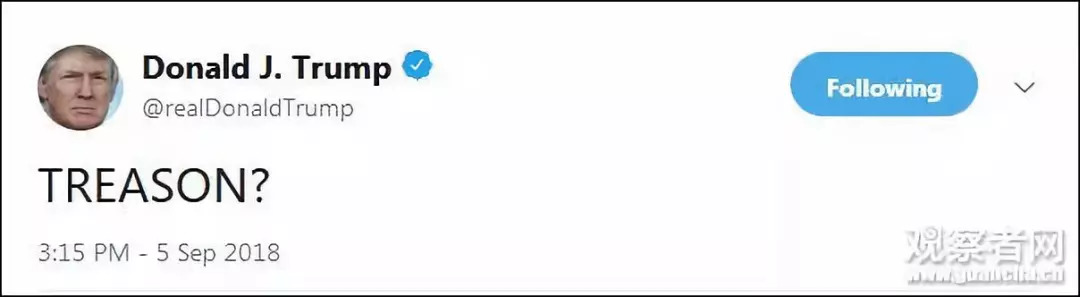 哇,本来伍德沃德的书就已经让特朗普气到不行了。现在还跑出来个身边人说这种话。于是9月5号一下午特朗普都在发推特!
