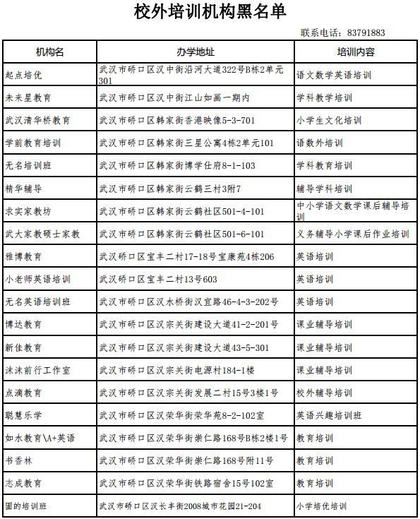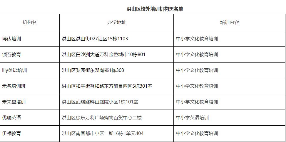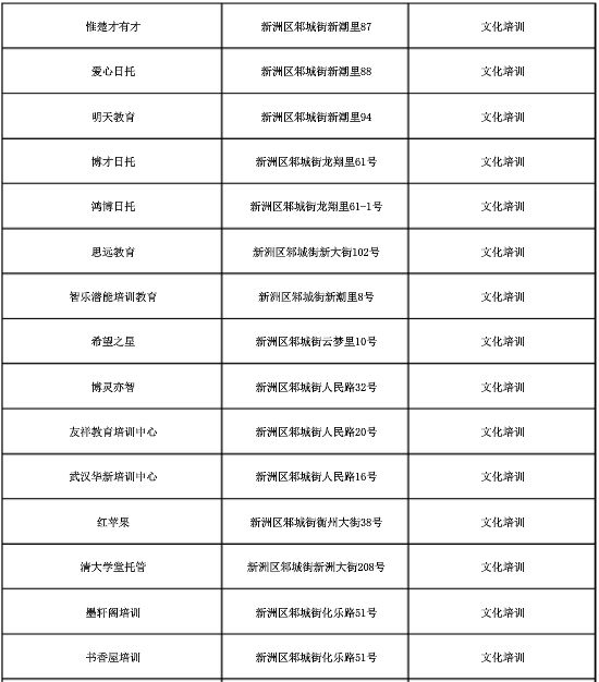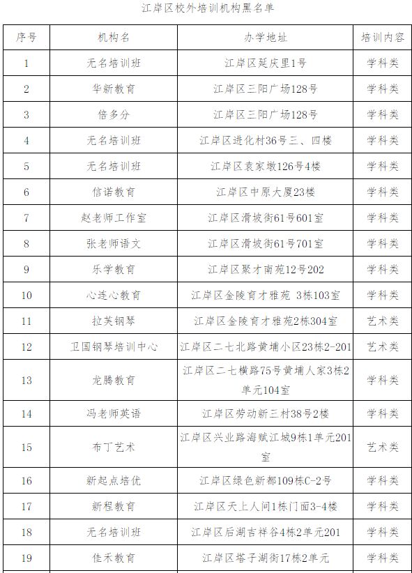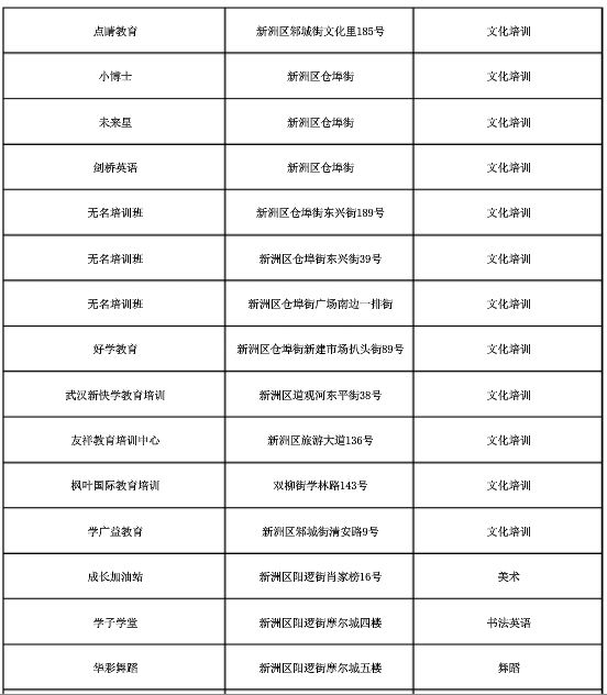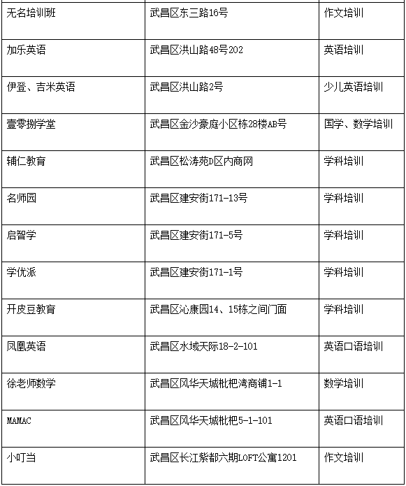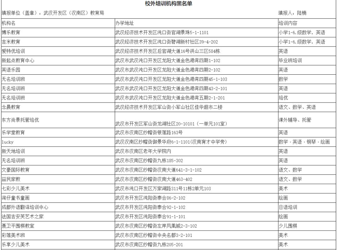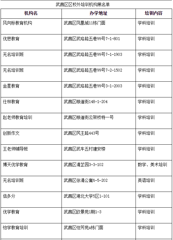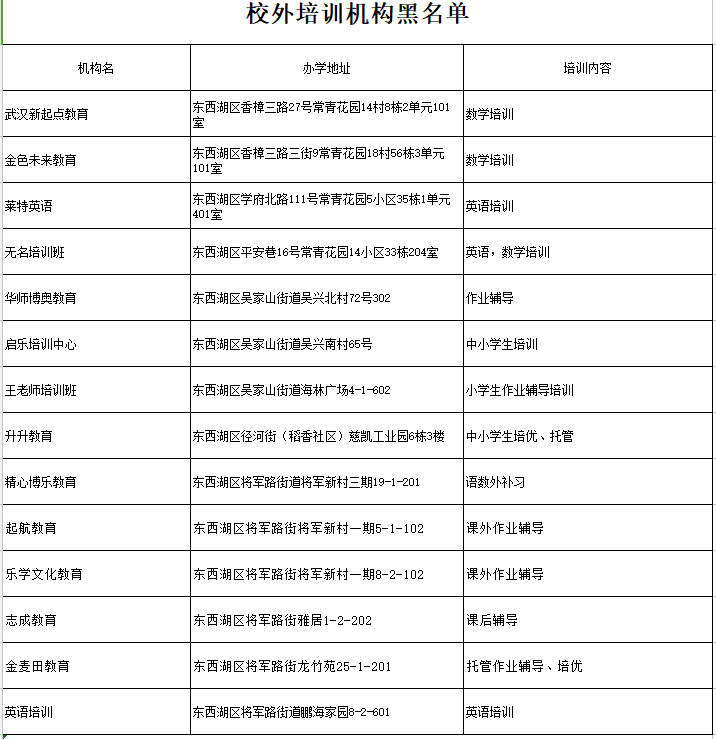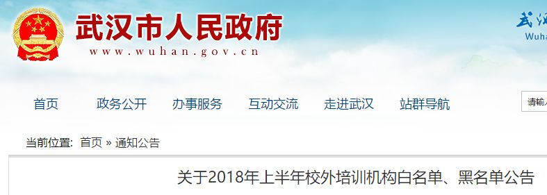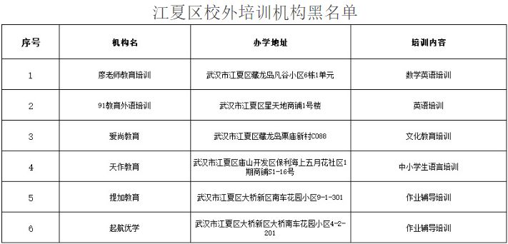 经各区教育部门上半年摸排,武汉市公布了办学行为规范的“有证有照”校外培训机构白名单,和完全不具备办学资质的“无证无照”校外培训机构黑名单。后期,武汉市还将另行公布已经取得营业执照的“有照无证”校外培训机构名单。