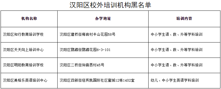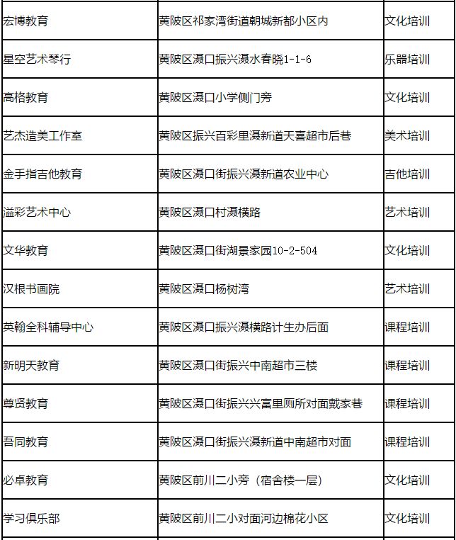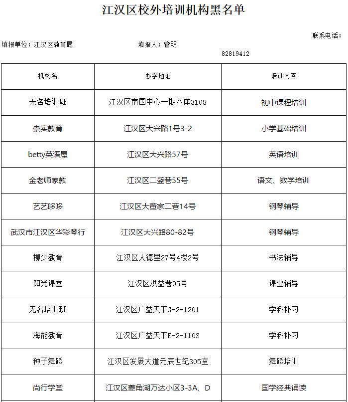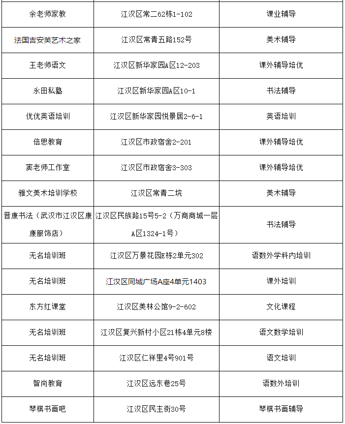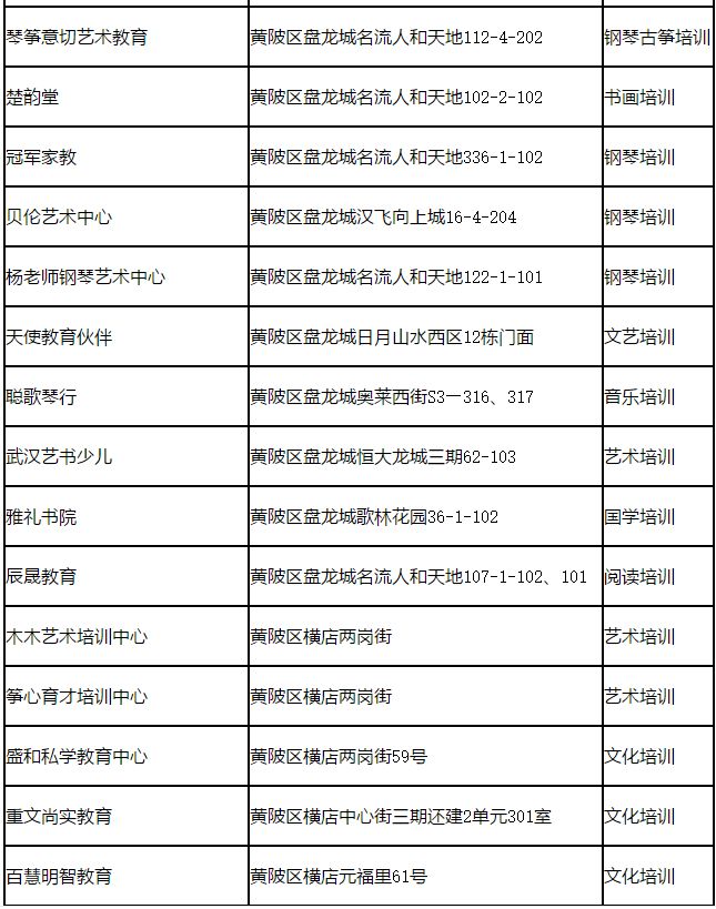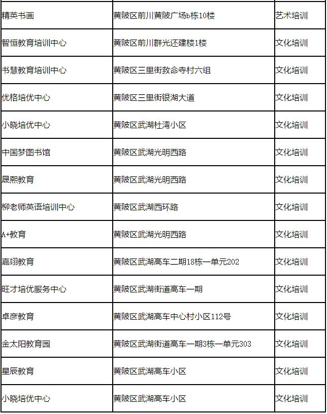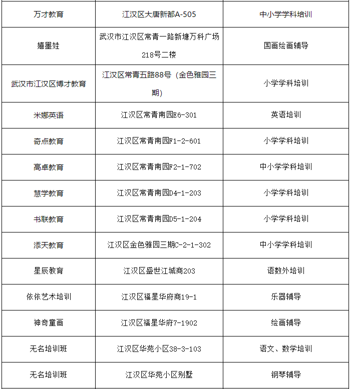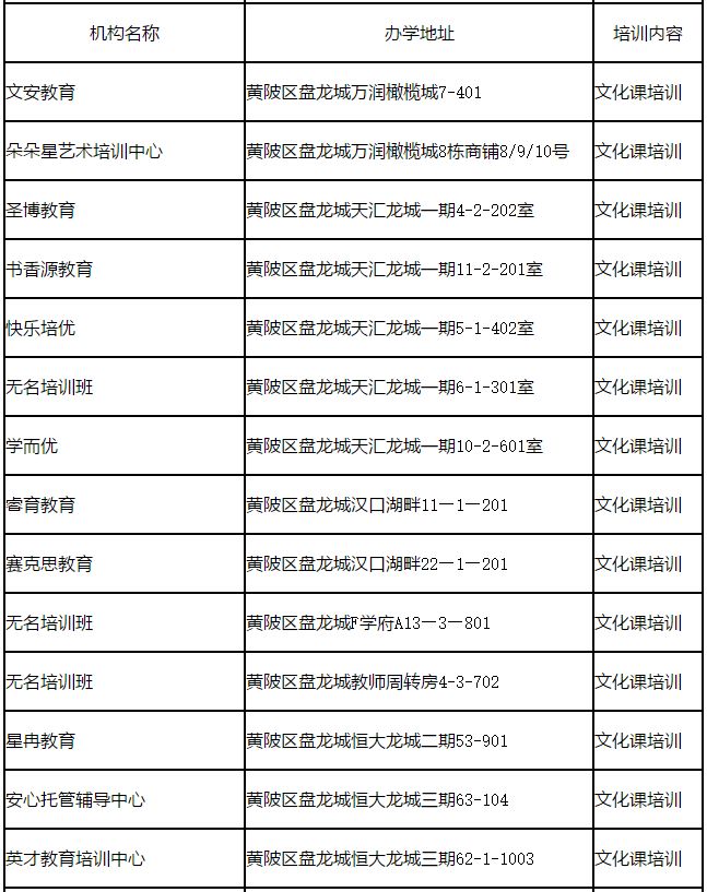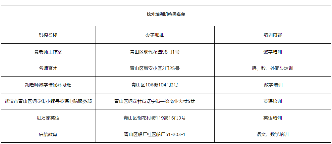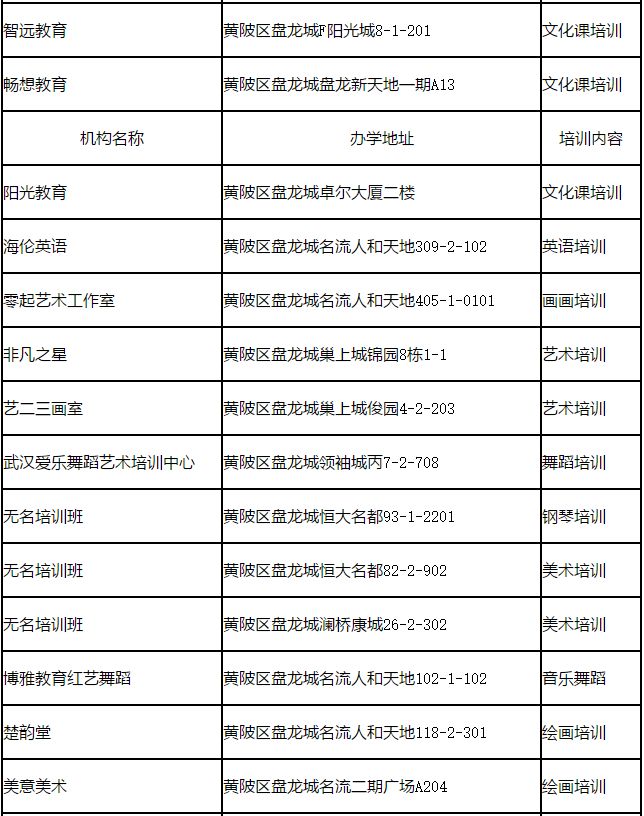 经各区教育部门上半年摸排,武汉市公布了办学行为规范的“有证有照”校外培训机构白名单,和完全不具备办学资质的“无证无照”校外培训机构黑名单。后期,武汉市还将另行公布已经取得营业执照的“有照无证”校外培训机构名单。