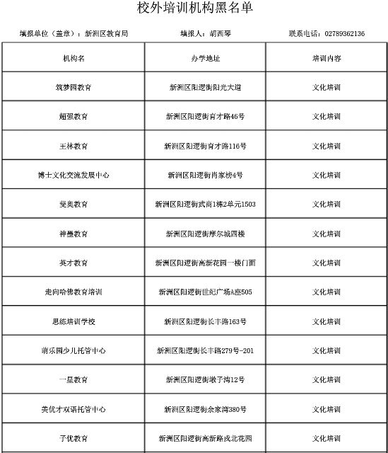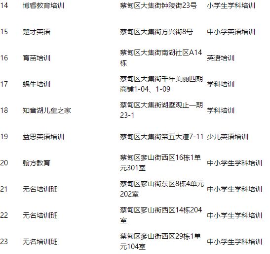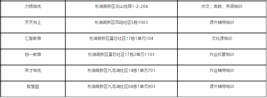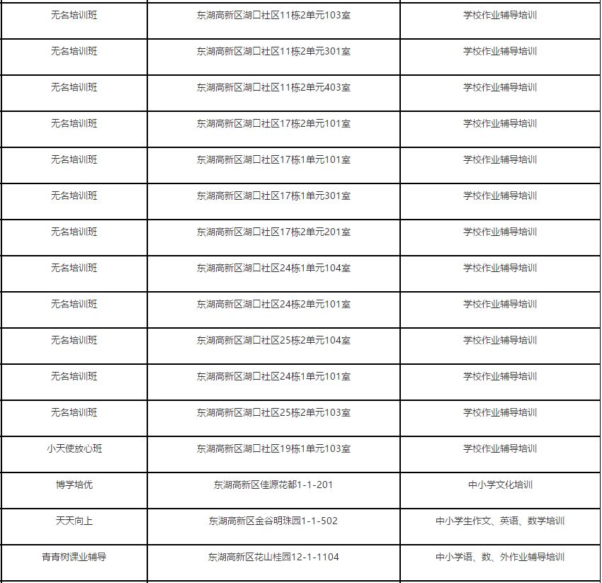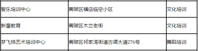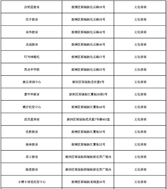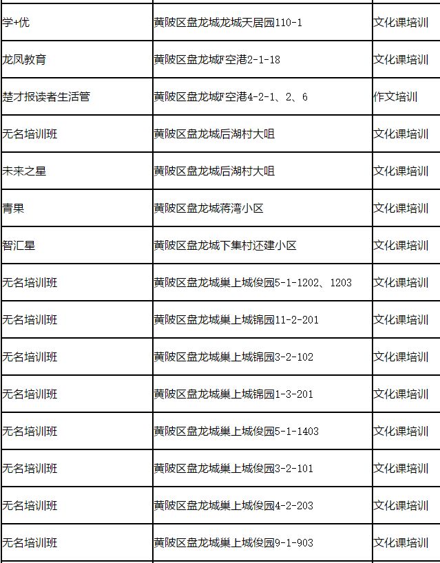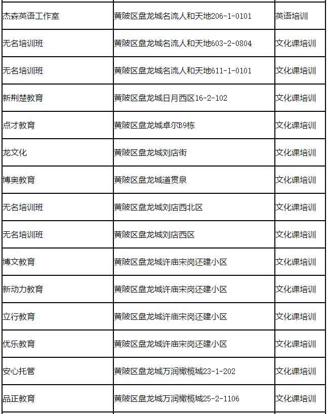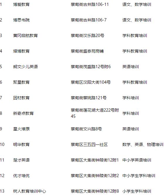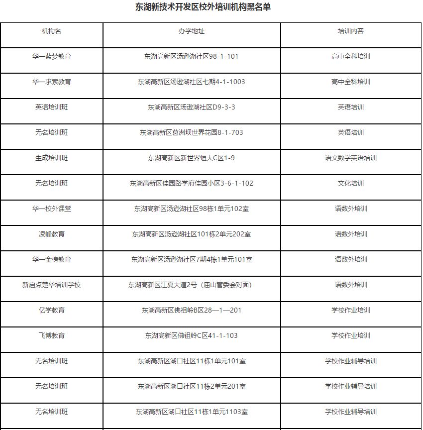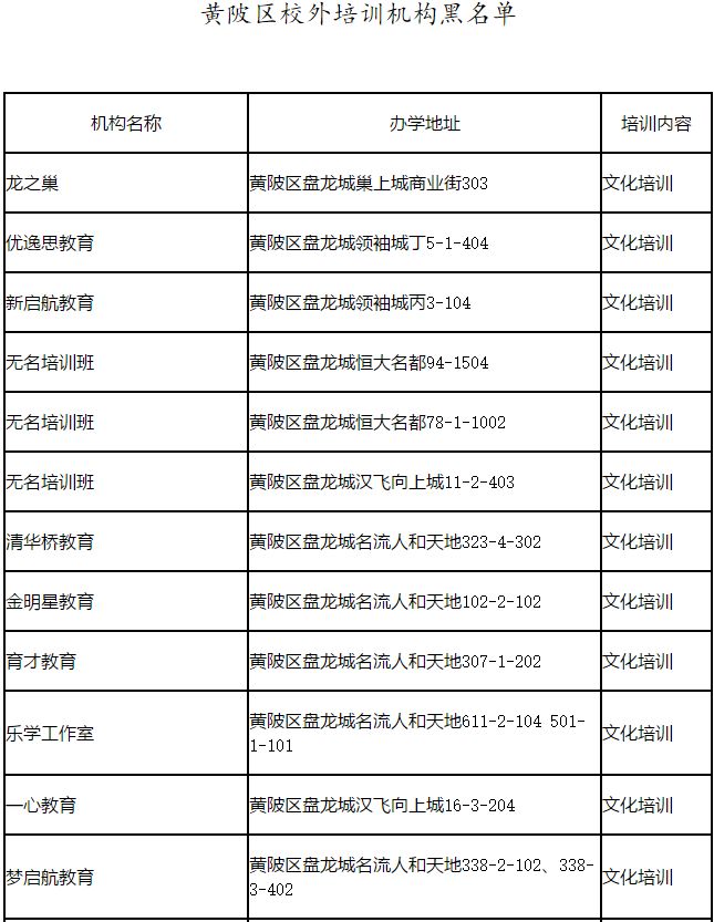 根据公布信息,黑名单中部分培训机构为“无名培训班”,各区数量也不一致,其中,黄陂区共117家培训机构上榜黑名单,数量最多;新洲有66家,东湖新技术开发区有37家,江岸区有25家,东湖风景区数量则为0。