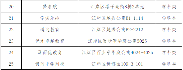 武汉市教育局有关人士表示,本名单为各区初步摸排结果,欢迎社会各界和广大群众进行监督。对今后摸排出的校外培训机构,该市将在下一轮公告中予以公布。各区将加大力度开展对违规校外培训的执法整治。同时,具备办证条件的可依法申报,不具备办证条件的应终止培训,并妥善处理遗留问题。同时,也提醒家长和学生理性选择合法校外培训服务,避免无资质校外培训机构可能给带来的纠纷。