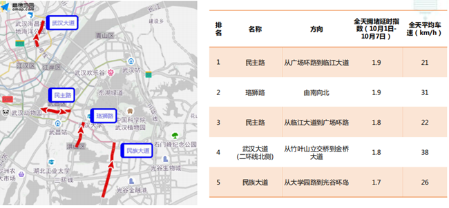 预计国庆期间城市内易发生拥堵缓行的路段有民主路、武汉大道、民族大道等。