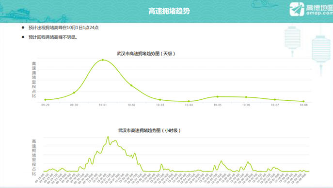 武汉方面,预计出程拥堵高峰在10月1日1点24点。预计回程拥堵高峰不明显。