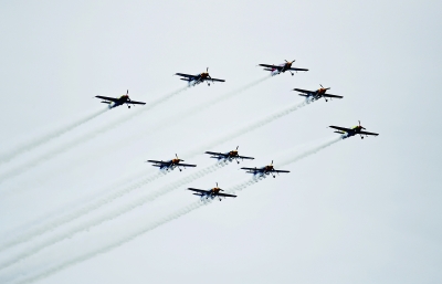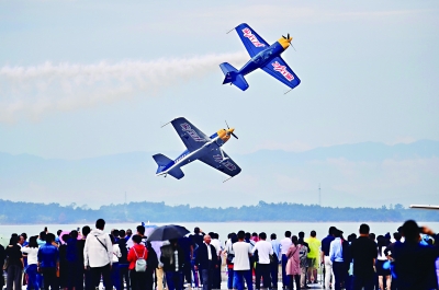 飞机表演队低空侧飞表演吸引众多观众