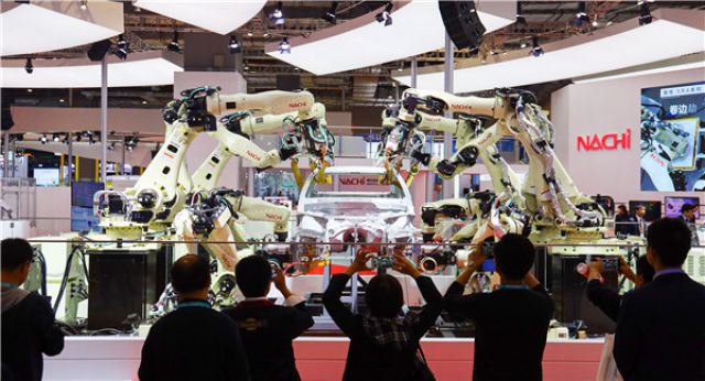 11月5日,日本那智不二越公司展出的点焊密集协作机器人在进行作业演示。新华社记者刘大伟摄