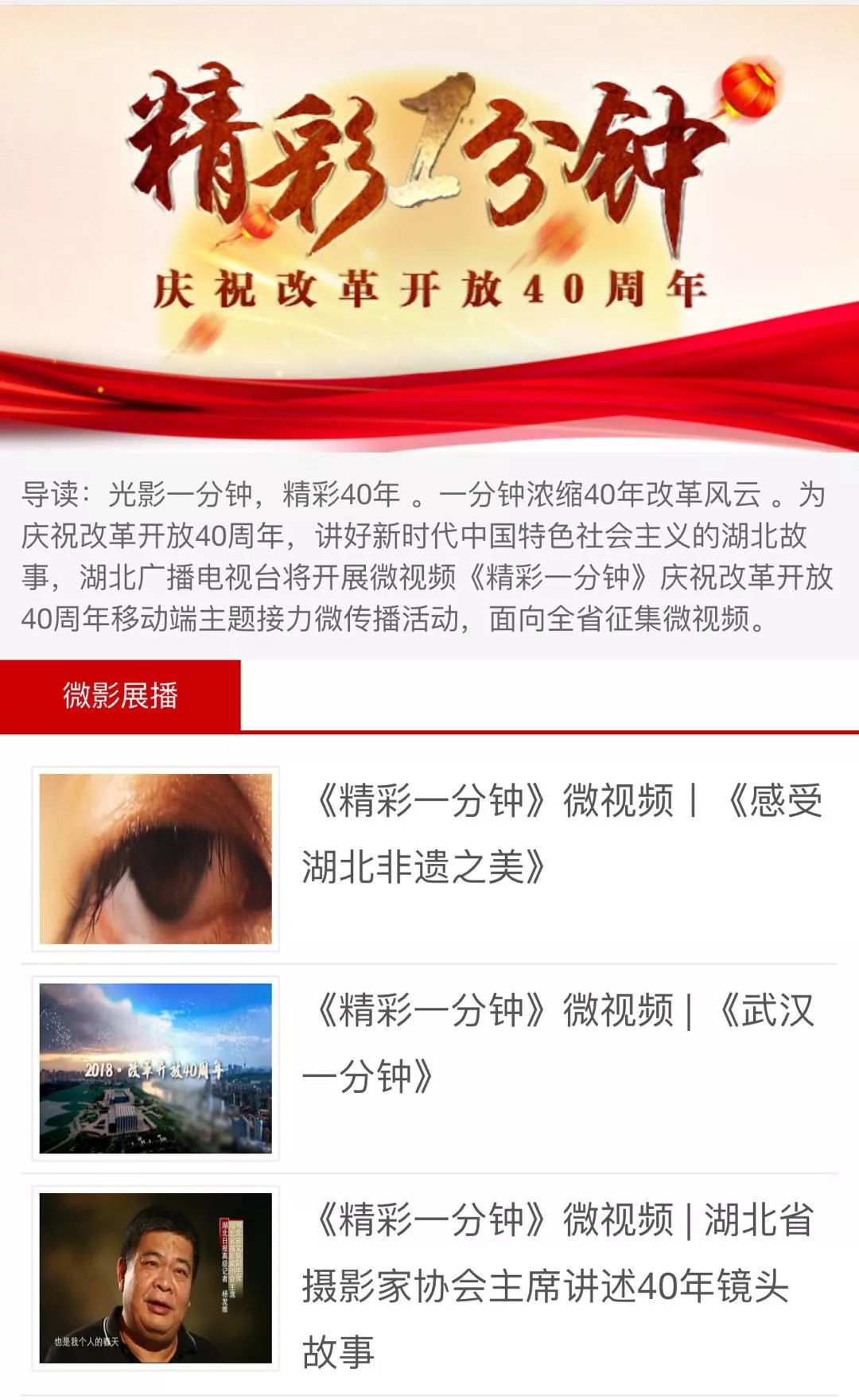 拟评选出40部作品,形成《精彩一分钟》专辑,向改革开放40周年献礼。