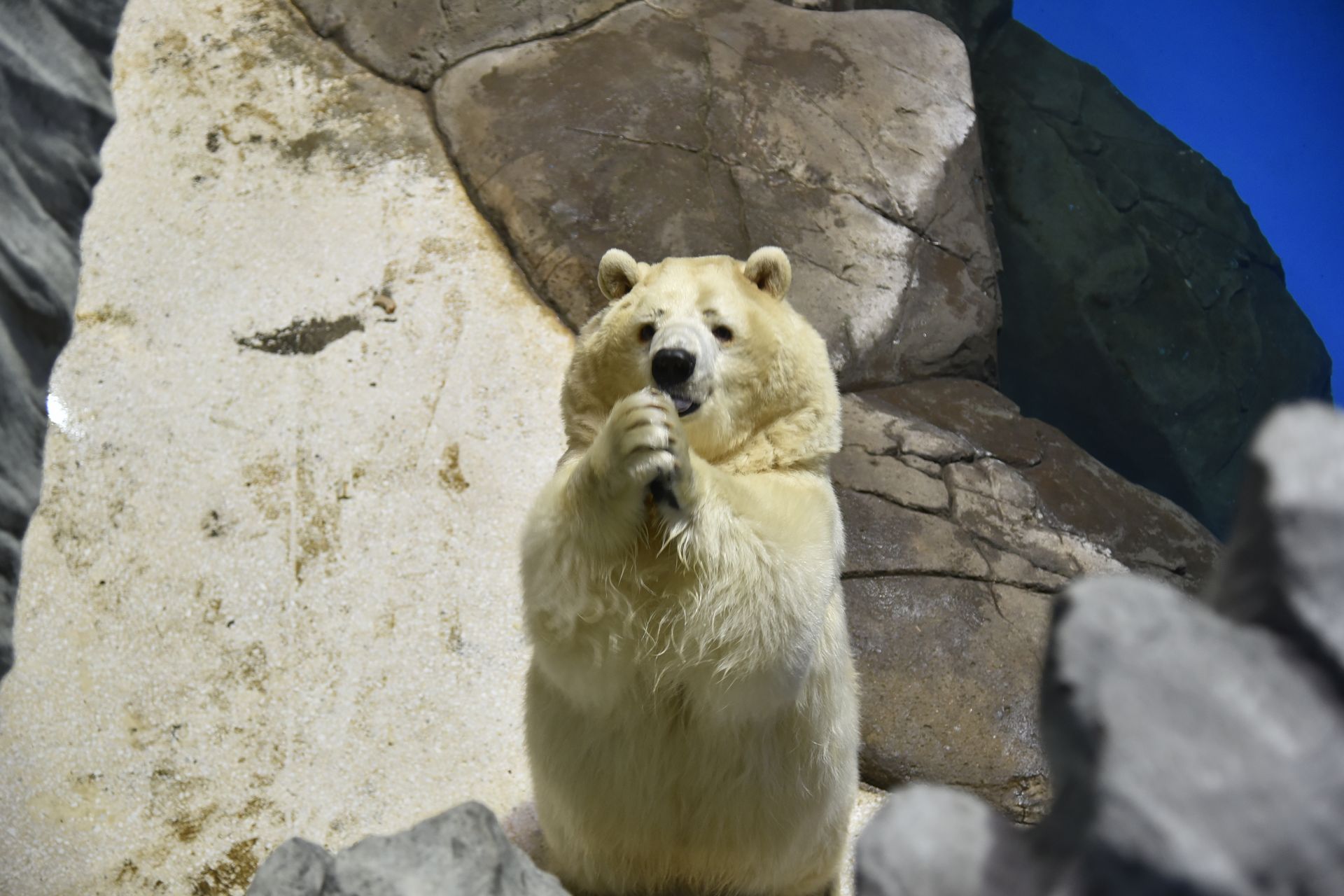 说到吃,就不得不提一下馆里另一只北极熊“静静”吃东西时候的可爱样子了。静静也是个吃货,还特别会撒娇。每次看到饲养员的时候她就会像小朋友过新年给长辈拜年一样双手合在一起摆动,好像在说“恭喜发财,美食拿来”,又像在说“拜托拜托,美食全部都给我好不好”。“梦龙”对新环境适合了以后,跟着“静静”也学了一手。他看到饲养员以后会立刻走到跟前,然后像个小朋友一样乖乖的坐着并立直上半身,举起双手在空中摇摆欢迎饲养员送来食物。