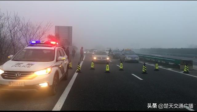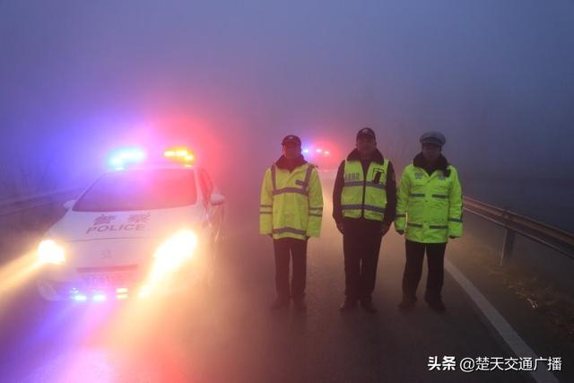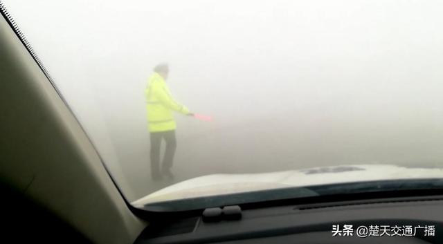大年初一凌晨3时许,二广高速(G55)荆州段能见度不足10米,辖区关闭荆州中、荆州南、公安、章庄铺收费站,公安大队民警在大雾中采用鸣警笛、沿着前方标线谨慎驾驶、缓慢巡逻。
