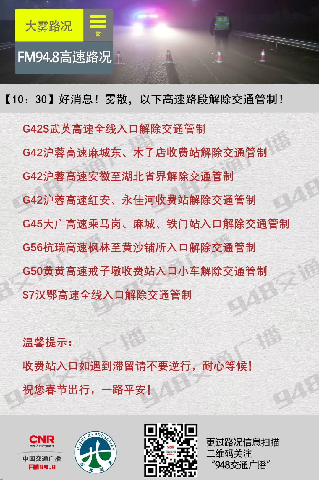 昨晚(2月4日)至今晨(2月5日),因大雾,湖北省内部分高速公路实行交通管制,请准备出行的朋友关注FM92.7楚天交通广播的实时路况插播,交管部门提示:大雾天气,减速慢行、就近驶离高速!