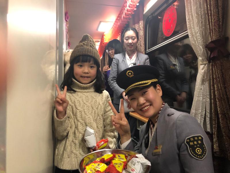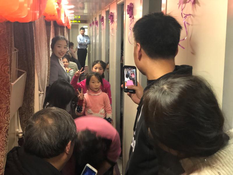 19点30分,旅客们在工作人员的引导下有序进站上车。在Z38次列车上,武汉客运段工作人员早早就在列车车厢内,布置了精美的福字、对联。透着节日的喜庆,水果、点心让旅客甜到心里,猜谜、对对联等小游戏引人入胜。从1954年开始,武汉客运段就在列车上开展独具特色的春晚,给旅客带去了很多欢乐,今年已经是第66年举办列车上的“春晚”。
