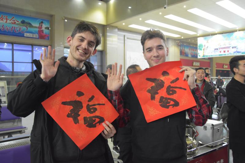 晚上20点整,武昌火车站还在二楼候车室内举办了联欢活动,车站组织青年职工们为旅客表演了丰富的节目,期间还为候车的旅客送去精美的小礼品和热腾腾的饺子。来自澳大利亚的旅客克里斯和杰克伯开心拿着车站工作人员送的“福”字,感受着中国传统节日文化氛围。