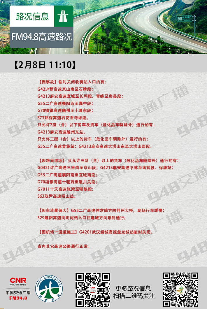 因事故,临时关闭收费站入口的有:G42沪蓉高速京山南至石牌段;G4213麻安高速随州南站、南漳至长坪段;G55二广高速襄阳西至隆中段;G70福银高速洛阳店至十堰东段;S73邓保高速石花至寺坪段。