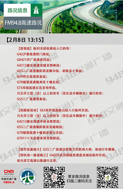 因路面结冰,只允许三型(含)以上的货车(危化品车辆除外)通行的有:G0421许广高速三里岗至京山段;G4213麻安高速平林至南营段、宜城站往随州方向入口;G55二广高速襄阳南至宜城南段;G70福银高速十堰西至漫川关段;G7011十天高速张湾至鄂陕段;S63双尹高速峪山站。