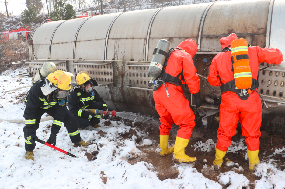 救援人员到达现场后发现,因路面结冰,该槽罐车冲出路面,侧翻到路基下的农田中,乙酸液体正从罐顶泄漏,空气中弥漫着刺鼻的气味,车上乘员已自救,无人员被困。随后,各战斗小组按照既定方案迅速展开行动。警戒组与现场交警将现场道路封闭;掩护组利用开花水枪对已经泄漏的乙酸进行稀释。堵漏组抵近泄漏点后发现,泄漏部位为罐体顶盖,由于顶盖处螺丝滑丝,且接口腐蚀,无法进行堵漏。指挥员当机立断,立即下令先用铁铲在泄漏点附近造多圈围堰,防止乙酸液体流入农田破坏环境,随后组织中队指战员利用塑料桶对正在泄漏的乙酸进行收集,并转移至空旷地带放置,同时大队全勤指挥部联系空罐车到场进行倒罐。