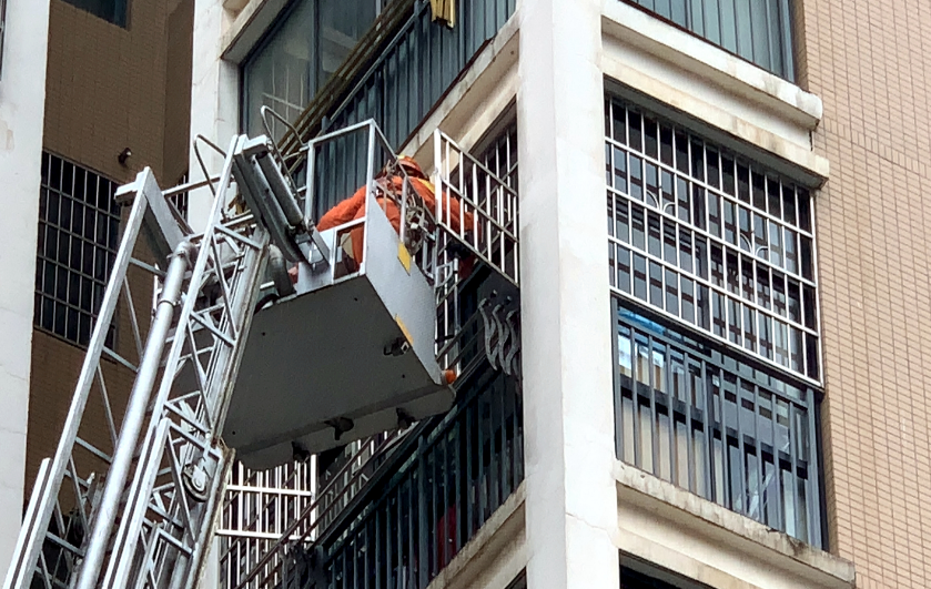 了解原委后,现场消防指挥员立即观察现场情况:防盗门门锁采用的是密码门锁,通过现有的技术开锁很难打开。经过几分钟的商讨和实地勘察,指挥员决定利用登高云梯车将一名消防员升至六楼的主卧室窗口处,从窗口进入房间,再将房门打开。经过一个小时的救援,消防员成功救出被困幼童,大人悬着的心总算放了下来。