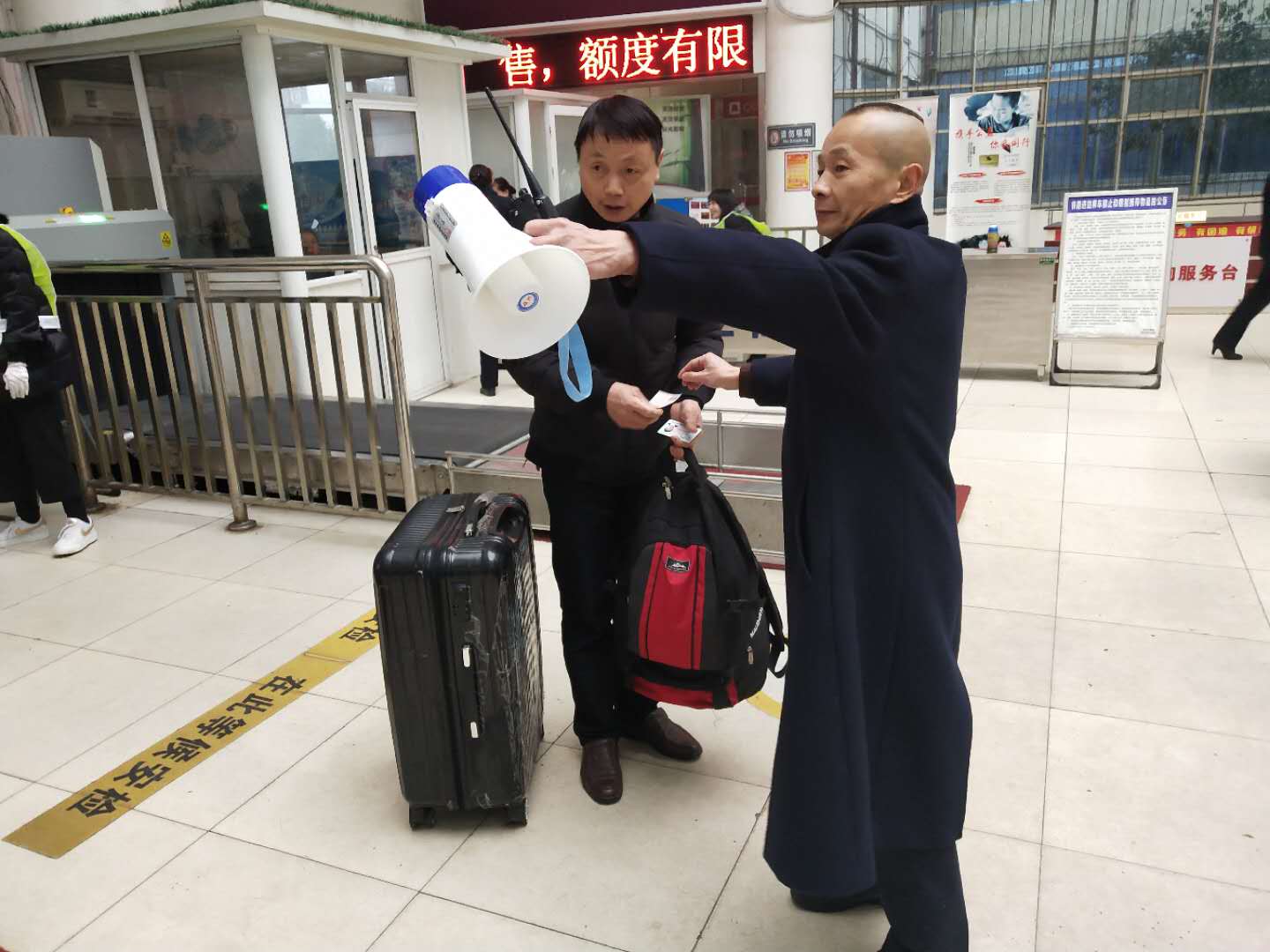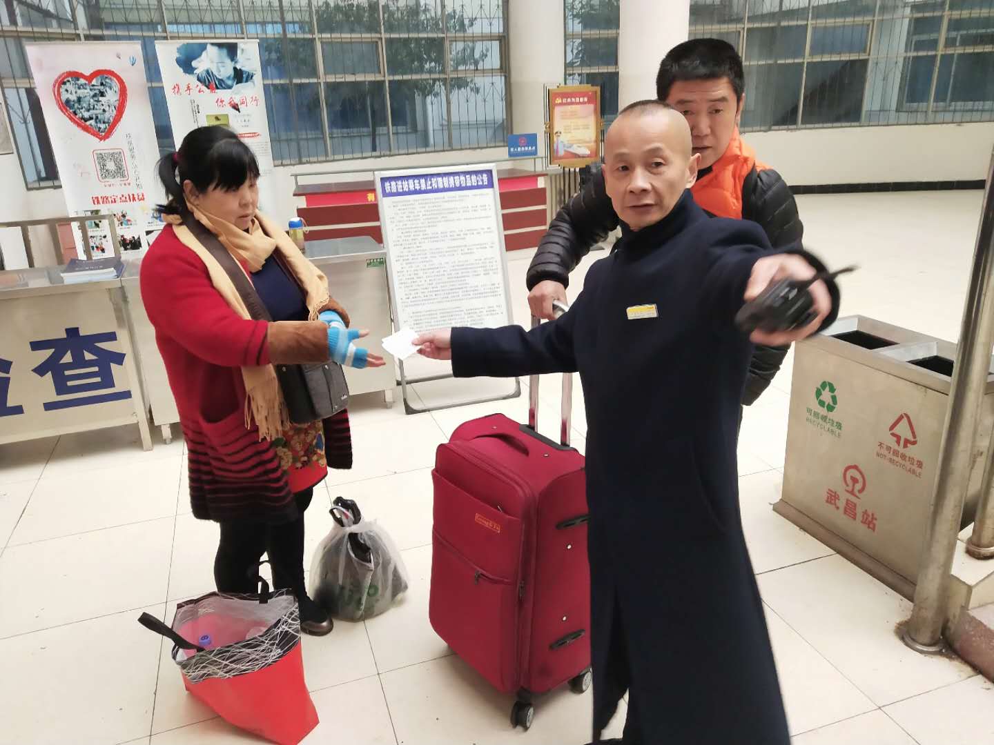 “三、六、九”往外走,初三以后,有的老乡就要赶回工地上班了。2月9日正月初五,李红兵像日常一样在候车室里进行乘降组织。左手喇叭,右手对讲机,这是李红兵不变的“标配”。上午10点,准备乘坐K4107次前往广州工作的张先生因为不大识字,给广州工友拎的特产又比较多,一时间急需有人“搭把手”。李红兵赶紧上前,一边帮忙拿行李,一边引导旅客进站候车。看着热心的李红兵,老乡想把腌好的腊鱼腊肉送给李红兵感谢他的帮助,李红兵婉言拒绝了,他说:“在家千日好,出门一时难,您到了我们站,就是 ‘红兵’服务台的‘亲人’。”