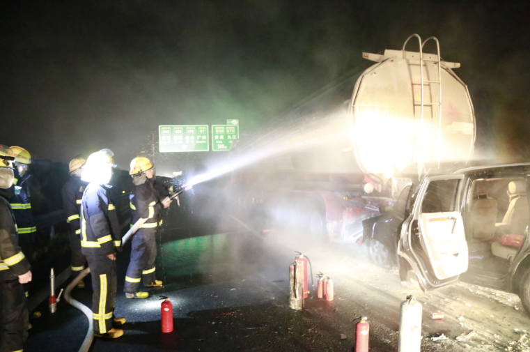 高警、路政到场后,迅速实施交通管制,防止油罐车爆炸引燃其他车辆,并与油罐车驾驶员使用车载灭火器对起火处进行扑救。消防指战员到达现场后只见现场一片狼藉,地上四处散落着汽车零件,奥迪车与油罐车因追尾而紧紧的扣在一起,四处充满着刺鼻的烧焦味。为防止油罐车燃烧而导致爆炸,消防员立即出一支水枪对两车连接处进行浇灌冷却。经过十余分钟的冷却后,消防指战员与高警人员协商调集一辆拖车将奥迪车拖走,让油罐车彻底离开火源。拖车到达后,消防员一边使用水枪冷却,拖车一边往回拉,经过十余分钟的努力,成功将奥迪车与油罐车分离,消防员继续对油罐车冷却后,收整器材归队。
