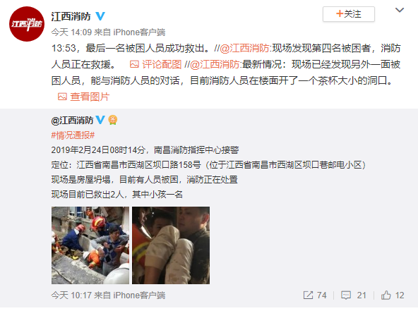 据江西省公安消防总队微博消息,24日13时53分,江西南昌房屋坍塌事故最后一名被困人员被成功救出。
