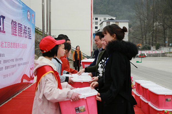 3月19日,省红十字基金会、恩施州红十字会联合州中心医院、州护理学会在恩施市三岔初级中学举办国际社工日志愿服务公益服务系列活动启动仪式,相关单位负责人参加。