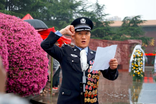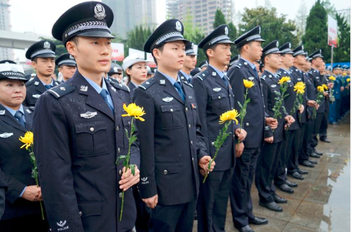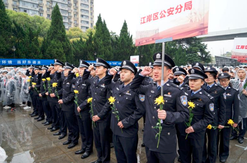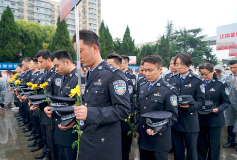 在雨中,分局50名青年民警整齐列队,庄严肃目。他们沉痛悼念,缅怀先烈,一件件感人的故事,一首首动人的英雄凯歌,一段段值得铭记的历史,回顾武汉抗战史、追忆先辈先烈人物,青年民警们鞠躬默哀,并给为中华民族独立和人民解放事业做出贡献的时代英雄敬献菊花。